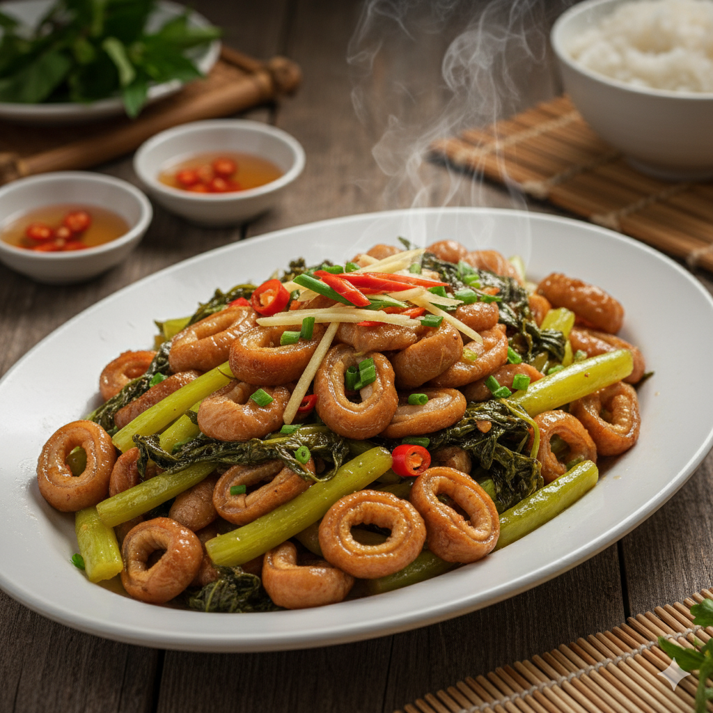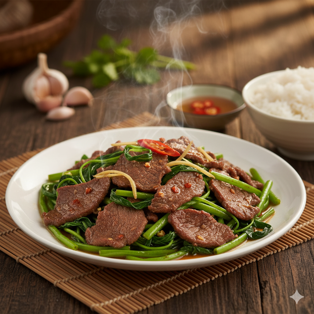 Thịt trâu xào rau muống là một trong những món ăn dân dã quen thuộc của người Việt, đặc biệt phổ biến ở vùng nông thôn Bắc Bộ. Sự kết hợp giữa thịt trâu ngọt mềm và rau muống giòn xanh tạo nên hương vị thơm ngon
