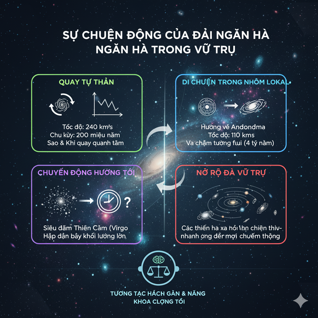 Dải Ngân Hà (Milky Way) là thiên hà xoắn ốc khổng lồ chứa hơn 200 tỷ ngôi sao, trong đó có Mặt Trời – ngôi sao trung tâm của Hệ Mặt Trời. Không chỉ đứng yên trong không gian, Dải Ngân Hà luôn chuyển động liên tục trong vũ trụ