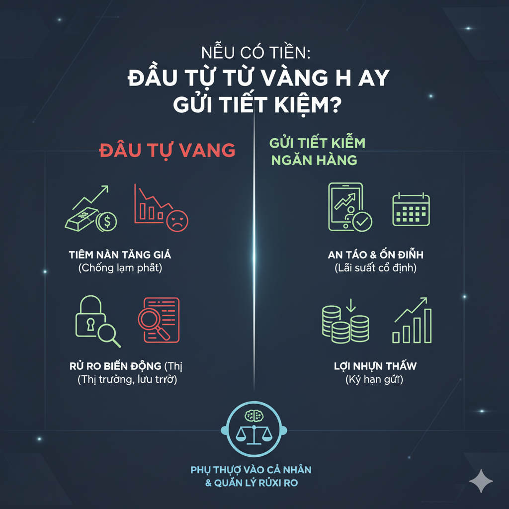 Trong bối cảnh kinh tế biến động, lạm phát, giá cả leo thang, nhiều người băn khoăn: có tiền thì nên đầu tư vào vàng hay gửi tiết kiệm ngân hàng để vừa an toàn vừa sinh lời? Đây là câu hỏi không dễ trả lời, bởi mỗi kênh đầu tư đều có ưu